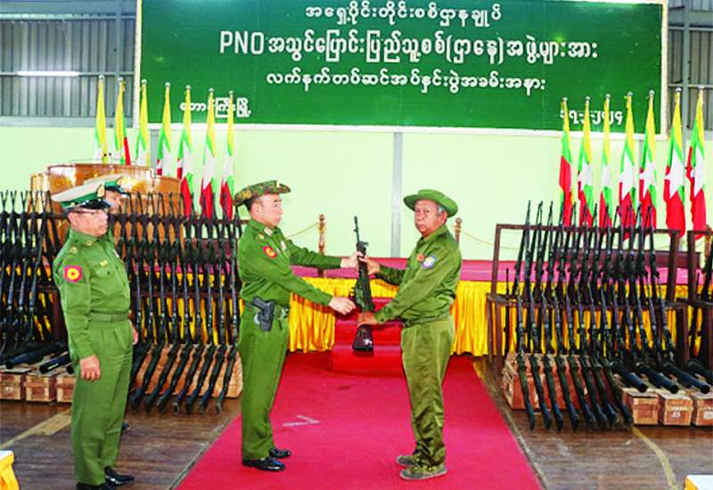 ရှမ်းပြည်နယ်(တောင်ပိုင်း) တောင်ကြီးမြို့၊ ရပ်စောက်မြို့၊ ဟိုပုံးမြို့၊ ပင်လောင်းမြို့၊ နောင်တရားမြို့နှင့် ကလောမြို့တို့ရှိ PNO အသွင်ပြောင်းပြည်သူ့စစ် (ဌာနေ) တပ်ဖွဲ့ဝင်များအား လက်နက်တပ်ဆင်အပ်နှင်းခြင်းကို ယနေ့နံနက်ပိုင်းတွင် အရှေ့ပိုင်းတိုင်းစစ်ဌာနချုပ် အားကစားခန်းမ၌ ပြုလုပ်ရာ ဒုတိယတိုင်းမှူး ဗိုလ်မှူးချုပ် ဝင်းဇော်မိုးနှင့် အဖွဲ့ဝင်များ၊ ပြည်သူ့စစ် (ဌာနေ) တပ်ဖွဲ့ဝင်များ၊ ဖိတ်ကြားထားသူများ တက်ရောက်ကြသည်။