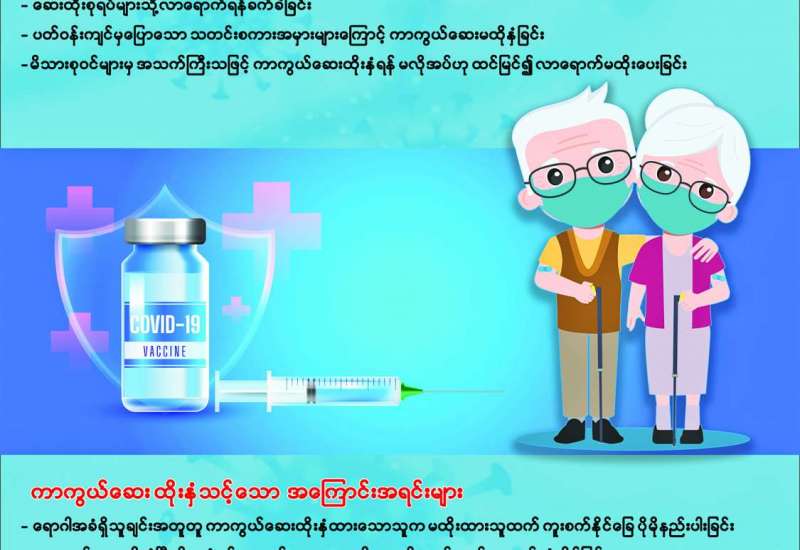 ကျန်းမာရေးဝန်ကြီးဌာန ပြည်သူ့ကျန်းမာရေးဦးစီးဌာန ဗဟိုတိုးချဲ့ ကာကွယ်ဆေးထိုးလုပ်ငန်းဌာနခွဲသည် ကိုဗစ်-၁၉ ရောဂါ ကာကွယ်ထိန်းချုပ်ရေးအတွက် တစ်နိုင်ငံလုံးအတိုင်းအတာဖြင့် ၂၇-၁-၂၀၂၁ ရက်နေ့မှစတင်၍ ကိုဗစ်-၁၉ ရောဂါ ကာကွယ်ဆေးကို ရာနှုန်းပြည့် ကာကွယ်ဆေးထိုးနှံရေး အစီအစဉ်အရ ဦးတည်အုပ်စုများသတ်မှတ်၍ ထိုးနှံပေးလျက်ရှိရာ ၂၆-၁-၂၀၂၄ ရက်နေ့အထိ အသက် (၅) နှစ်နှင့်အထက်ရှိသော ကာကွယ်ဆေးထိုးနှံရန် အကျုံးဝင်သူလူဦးရေ ၄၃ သန်းကျော်အနက် လူဦးရေ ၃၉ ဒသမ ၈ သန်းခန့်ကို ကိုဗစ်-၁၉ ရောဂါကာကွယ်ဆေး အနည်းဆုံးတစ်ကြိမ် ထိုးနှံပေးနိုင်ခဲ့ပြီး ကာကွယ်ဆေးလွှမ်းခြုံမှု ၉၂ ရာခိုင်နှုန်းရရှိခဲ့ပြီး ကိုဗစ်-၁၉ ရောဂါကာကွယ်ဆေး အကြိမ်ပြည့်ထိုးနှံ ပြီးသည့် လူဦးရေမှာ ၃၆ ဒသမ ၃ သန်းခန့် ရှိပြီဖြစ်သောကြောင့် ကာကွယ် ဆေးလွှမ်းခြုံမှု ၈၄ ရာခိုင်နှုန်းရရှိခဲ့ပြီး ဖြစ်ပါသည်။