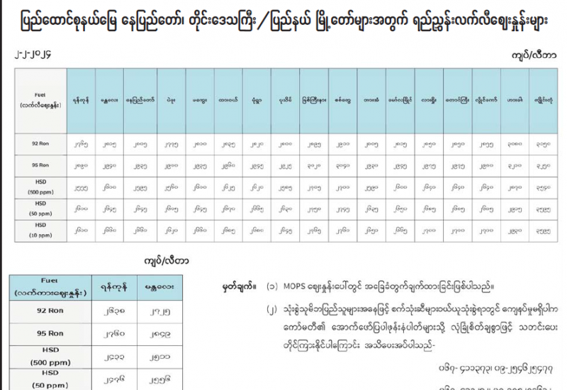 ရန်ကုန်မြို့နှင့် မန္တလေးမြို့အတွက် ရည်ညွှန်းလက်ကားဈေးနှုန်းများနှင့် ပြည်ထောင်စုနယ်မြေ နေပြည်တော်၊ တိုင်းဒေသကြီး/ ပြည်နယ် မြို့တော်များအတွက် ရည်ညွှန်းလက်လီဈေးနှုန်းများ