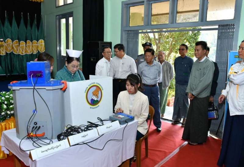 ပြည်ထောင်စုရွေးကောက်ပွဲကော်မရှင်အနေဖြင့် ပါတီစုံဒီမိုကရေစီအထွေထွေရွေးကောက်ပွဲ ကျင်းပရန်အတွက် ကြိုတင်ပြင်ဆင်မှုလုပ်ငန်းများ ဆောင်ရွက်လျက်ရှိရာ ပြည်ထောင်စုရွေးကောက်ပွဲကော်မရှင်ဥက္ကဋ္ဌ ဦးသိန်းစိုးသည် ကော်မရှင်အဖွဲ့ဝင်များ လိုက်ပါလျက် ယနေ့နံနက် ၁၀း၀၀ နာရီအချိန်က မန္တလေးတိုင်းဒေသကြီး၊ အောင်မြေသာစံမြို့နယ် အမှတ် (၁) အခြေခံပညာအထက်တန်းကျောင်း၌ ကျင်းပပြုလုပ်သည့် မြန်မာအီလက်ထရောနစ်မဲပေးစက်ဖြင့် လက်တွေ့စမ်းသပ်မဲပေးနေမှုကို ကြည့်ရှုစစ်ဆေးသည်။