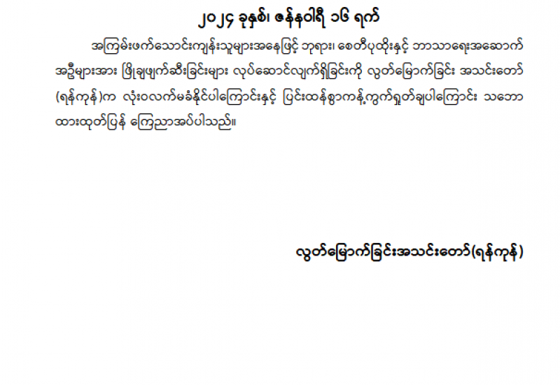 အကြမ်းဖက်သောင်းကျန်းသူများအနေဖြင့် ဘုရား၊ စေတီပုထိုးနှင့် ဘာသာရေးအဆောက် အဦများအား ဖြိုချဖျက်ဆီးခြင်းများ လုပ်ဆောင်လျက်ရှိခြင်းကို လွတ်မြောက်ခြင်း အသင်းတော် (ရန်ကုန်)က လုံးဝလက်မခံနိုင်ပါကြောင်းနှင့် ပြင်းထန်စွာကန့်ကွက်ရှုတ်ချပါကြောင်း သဘော ထားထုတ်ပြန် ကြေညာအပ်ပါသည်။