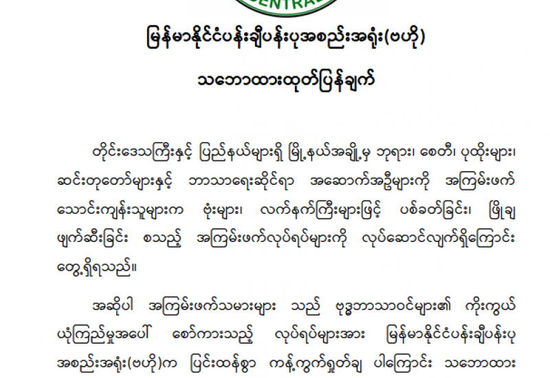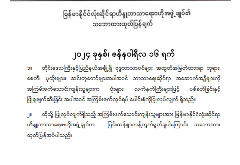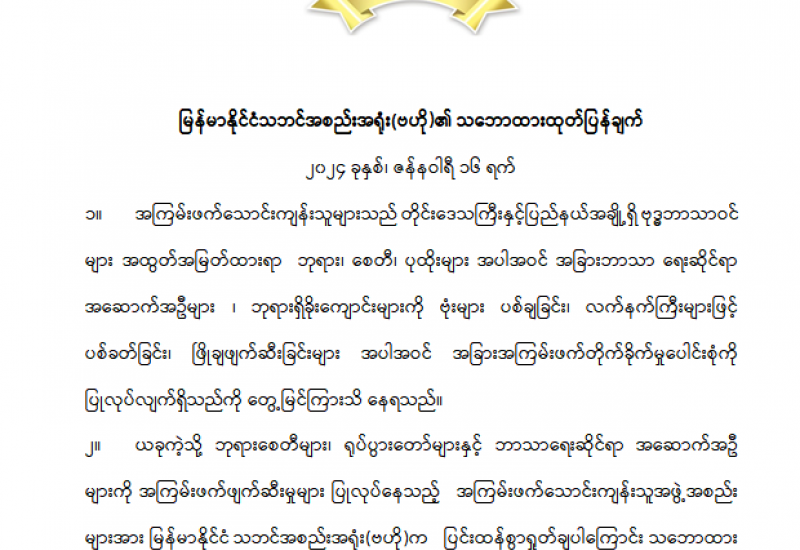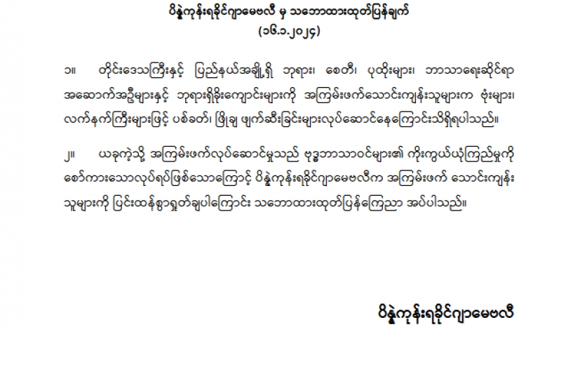 ၁။ အကြမ်းဖက်သောင်းကျန်းသူအဖွဲ့နှင့် PDF အမည်ခံအကြမ်းဖက်သမားများအနေဖြင့် ဗုဒ္ဓဘာသာဝင်များအထွတ်အမြတ်ထားရာ ဘုရားစေတီများအား ဖြိုချဖျက်ဆီးခြင်း၊ သာသနာ ရေးအဆောက်အဦများအား ပစ်ခတ်ခြင်းတို့ကို လုပ်ဆောင်လျက်ရှိသည်ကို စိတ်မကောင်းဖွယ်ရာ မြင်တွေ့ကြားသိနေရပါသည်။