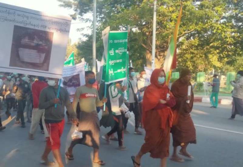 စစ်ကိုင်းမြို့တွင် ဗုဒ္ဓဘာသာဝင်များ အထွတ်အမြတ်ထားရာ စေတီ၊ ပုထိုးများ ဗုဒ္ဓဆင်းတုတော်မျာအား ဖျက်ဆီးနေသည့် အကြမ်းဖက်သောင်းကျန်းသူများနှင့် ပြည်ဖျက်မိစ္ဆာများအား ကန့်ကွက်ရှုတ်ချပွဲကို ယနေ့ နံနက်ပိုင်းက စစ်ကိုင်းမြို့၊ ကမ်းနားလမ်းမှ စုရပ်အဖြစ် မြို့မဘော့လုံးအားကစားကွင်းတွင် ပြုလုပ်ခဲ့ကြောင်းသိရသည်။