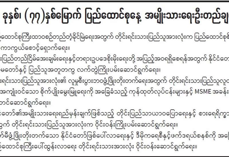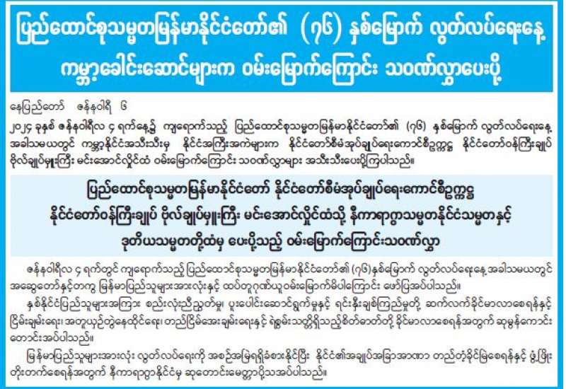 ပြည်ထောင်စုသမ္မတမြန်မာနိုင်ငံတော်၏ (၇၆) နှစ်မြောက် လွတ်လပ်ရေးနေ့ ကမ္ဘာ့ခေါင်းဆောင်များက ဝမ်းမြောက်ကြောင်း သဝဏ်လွှာပေးပို့