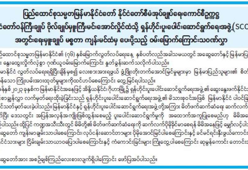 ပြည်ထောင်စုသမ္မတမြန်မာနိုင်ငံတော် နိုင်ငံတော်စီမံအုပ်ချုပ်ရေးကောင်စီဥက္ကဋ္ဌ နိုင်ငံတော်ဝန်ကြီးချုပ် ဗိုလ်ချုပ်မှူးကြီး မင်းအောင်လှိုင်ထံသို့ ရှန်ဟိုင်းပူးပေါင်းဆောင်ရွက်ရေးအဖွဲ့(SCO) အတွင်းရေးမှူးချုပ် မစ္စတာကျန်းမင်ထံမှ ပေးပို့သည့် ဝမ်းမြောက်ကြောင်းသဝဏ်လွှာ