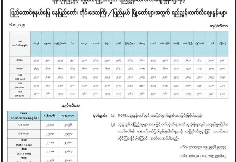 ရန်ကုန်မြို့နှင့် မန္တလေးမြို့အတွက် ရည်ညွှန်းလက်ကားဈေးနှုန်းများနှင့် ပြည်ထောင်စုနယ်မြေ နေပြည်တော်၊ တိုင်းဒေသကြီး/ပြည်နယ် မြို့တော်များအတွက် ရည်ညွှန်းလက်လီဈေးနှုန်းများ
