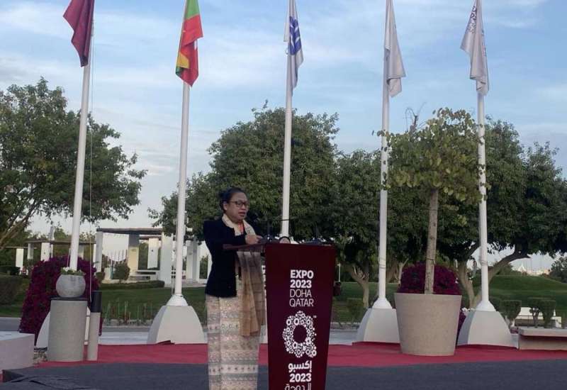 ကာတာနိုင်ငံ၊ ဒိုဟာမြို့တွင် ကျင်းပလျက်ရှိသော Expo 2023 Dohaတွင် စီးပွားရေးနှင့် ကူးသန်းရောင်းဝယ်ရေးဝန်ကြီးဌာန၊ မြန်မာကုန်သွယ်မှုမြှင့်တင်ရေးအဖွဲ့၏ ကြီးကြပ်ကွပ်ကဲမှုဖြင့် မြန်မာပြခန်းဆောင်ကို ပါဝင်ပြသလျက်ရှိပြီးExpo 2023 Doha ၏ မြန်မာနေ့အခမ်းအနားကို ယနေ့တွင် ကာတာနိုင်ငံ၊ ဒိုဟာမြို့၊ AI B Park ရှိ Expo House ၌ ကျင်းပရာ စီးပွားရေးနှင့် ကူးသန်းရောင်းဝယ်ရေးဝန်ကြီးဌာန၊ မြန်မာကုန်သွယ်မှုမြှင့်တင်ရေးအဖွဲ့ ညွှန်ကြားရေးမှူးချုပ် ဒေါ်နော်မူတာကပေါ၊ Expo 2023 Doha ၏ Secretary General Mr. Mohamed alkoori နှင့် ပြပွဲတွင် ပါဝင်ပြသသည့် နိုင်ငံများမှ Commissioner General များ တက်ရောက်ကြသည်။