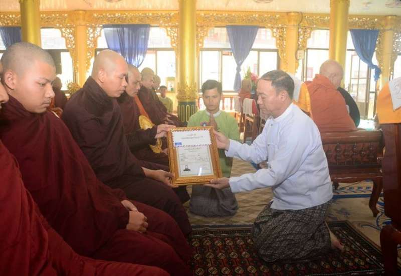 (၇၆) ကြိမ်မြောက် တိပိဋကဓရ တိပိဋကကောဝိဒ ရွေးချယ်ရေးစာမေးပွဲတွင် တိပိဋကဓရ တိပိဋကကောဝိဒ (၁၆) ပါးမြောက်ဘွဲ့တံဆိပ်တော်မြတ်ရရှိတော်မူသည့် ဆရာတော်ထံသို့ ပြည်ထောင်စုသမ္မတမြန်မာနိုင်ငံတော်၊ နိုင်ငံတော်စီမံအုပ်ချုပ်ရေးကောင်စီဥက္ကဋ္ဌ နိုင်ငံတော်ဝန်ကြီးချုပ် ဗိုလ်ချုပ်မှူးကြီး သတိုးမဟာသရေစည်သူသတိုးသီရိသုဓမ္မ မင်းအောင်လှိုင်ထံမှ ဆက်ကပ်ပေးပို့သည့် ဂုဏ်ယူဝမ်းမြောက်ကြောင်း သဝဏ်လွှာဆက်ကပ်သည့် အခမ်းအနားအား ရန်ကုန်တိုင်းဒေသကြီး၊ ဒဂုံမြို့နယ်၊ မင်းကွန်းတိပိဋက နိကာယကျောင်းတွင် ကျင်းပသည်။
