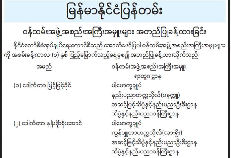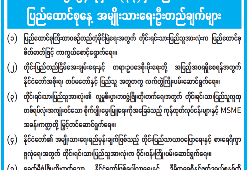 (၁) ပြည်ထောင်စုကြီးထာဝစဉ်တည်တံ့ခိုင်မြဲရေးအတွက် တိုင်းရင်းသားပြည်သူအားလုံးက ပြည်ထောင်စုစိတ်ဓာတ်ဖြင့် ကာကွယ်စောင့်ရှောက်ရေး။