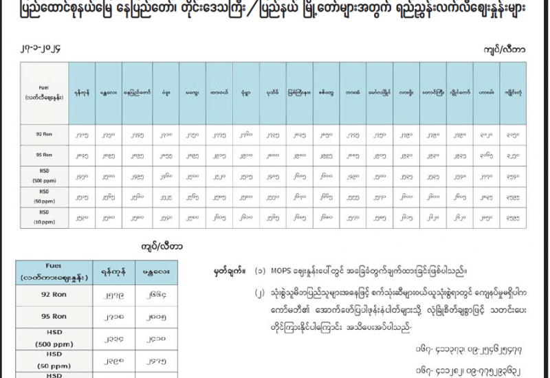 ရန်ကုန်မြို့နှင့် မန္တလေးမြို့အတွက် ရည်ညွှန်းလက်ကားဈေးနှုန်းများနှင့် ပြည်ထောင်စုနယ်မြေ နေပြည်တော်၊ တိုင်းဒေသကြီး/ပြည်နယ် မြို့တော်များအတွက် ရည်ညွှန်းလက်လီဈေးနှုန်းများ