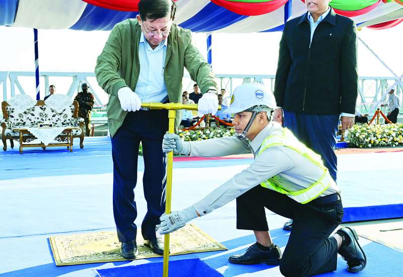 ရန်ကုန်တိုင်းဒေသကြီးအတွင်းရှိ ပဲခူးမြစ်ကူးတံတား (သန်လျင်တံတားအမှတ်-၃) တံတားဆက်ခြင်း အထိမ်းအမှတ် ရွှေမူလီတပ်ဆင်ခြင်း မင်္ဂလာအခမ်းအနားကို ယနေ့နံနက်ပိုင်းတွင် ကျင်းပပြုလုပ်ရာ နိုင်ငံတော်စီမံအုပ်ချုပ်ရေးကောင်စီဥက္ကဋ္ဌ နိုင်ငံတော်ဝန်ကြီးချုပ် ဗိုလ်ချုပ်မှူးကြီး မင်းအောင်လှိုင် တက်ရောက်ချီးမြှင့်ပြီး ရွှေမူလီကို တပ်ဆင်ပေးသည်။