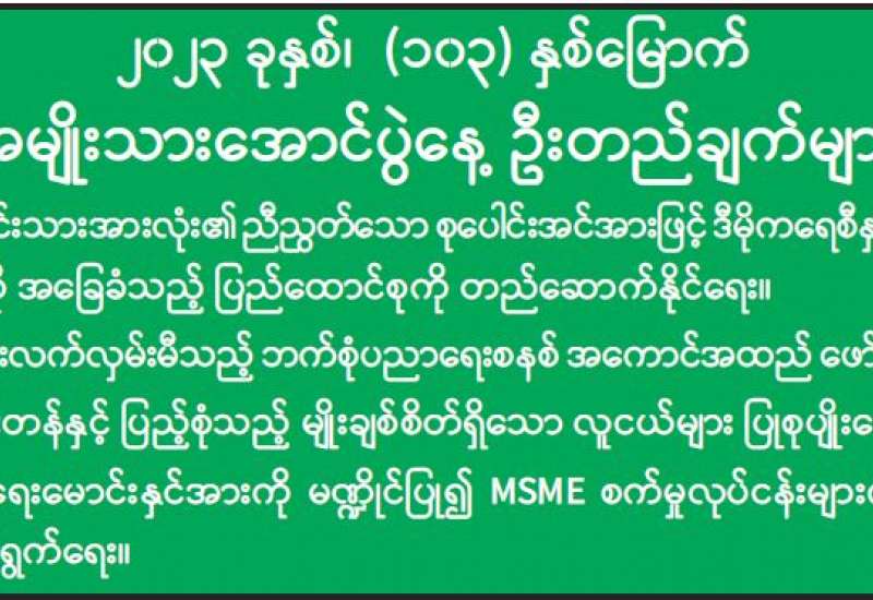 နိုင်ငံတော်စီမံအုပ်ချုပ်ရေးကောင်စီသည် နိုင်ငံ့စီးပွားမြင့်မားစေရေးနှင့် ပြည်သူလူထုတစ်ရပ်လုံး၏ လူမှုစီးပွားဘဝတိုးတက်စေရေးအတွက် “သွင်းကုန်အစားထိုးရန်နှင့် ပို့ကုန်ကဏ္ဍမြှင့်တင်နိုင်ရန်” ရည်ရွယ်၍ ဒေသထွက်ကုန်ကြမ်းများကို အသုံးပြုကာ တစ်ပိုင်တစ်နိုင် ကိုယ်ပိုင်စီးပွားရေးလုပ်ငန်းဖြင့် အသေးစား၊ အငယ်စား၊ အလတ်စား စီးပွားရေးလုပ်ငန်း(MSME)များကို အားပေးကူညီပြီး အလုပ်အကိုင် အခွင့်အလမ်းများကို အဓိကထား ဖန်တီးဖော်ဆောင်ပေးလျက်ရှိသည်။