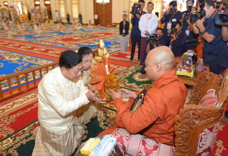 ပြည်ထောင်စုသမ္မတမြန်မာနိုင်ငံတော်၊ နိုင်ငံတော်စီမံအုပ်ချုပ်ရေးကောင်စီ ၂၀၂၃ ခုနှစ် ကထိန်သင်္ကန်း ဆက်ကပ်လှူဒါန်းပွဲအခမ်းအနားကို ယနေ့နံနက်ပိုင်းတွင် နေပြည်တော်ရှိ ဥပ္ပါတသန္တိစေတီတော်၊ သာသနာ့မဟာဗိမာန်တော်၌ ကျင်းပပြုလုပ်ရာ နိုင်ငံတော်စီမံအုပ်ချုပ်ရေးကောင်စီဥက္ကဋ္ဌ နိုင်ငံတော်ဝန်ကြီးချုပ် ဗိုလ်ချုပ်မှူးကြီး မင်းအောင်လှိုင်နှင့် ဇနီး ဒေါ်ကြူကြူလှတို့ တက်ရောက်၍ ကထိန်လျာသင်္ကန်းနှင့် လှူဖွယ်ပစ္စည်းများ ဆက်ကပ်လှူဒါန်းသည်။