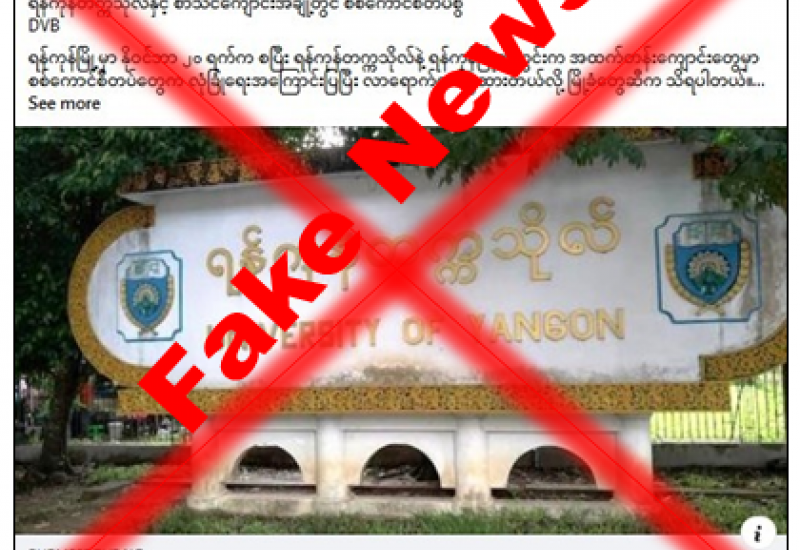 ရန်ကုန်မြို့တွင် နိုဝင်ဘာလ ၂၀ ရက်နေ့က စ၍ ရန်ကုန်တက္ကသိုလ်နှင့် အခြေခံပညာအထက်တန်းကျောင်းများတွင် လုံခြုံရေးတပ်ဖွဲ့ဝင်များက လုံခြုံရေးအကြောင်းပြပြီး လာရောက်တပ်စွဲထားကြောင်း မြို့ခံတွေဆီက သိရှိရတယ်လို့ မဟုတ်မမှန်သတင်းများ လူမှုကွန်ရက်စာမျက်နှာများတွင် ရေးသားဖြန့်ဝေလျက်ရှိကြောင်း တွေ့ရှိရသည်။