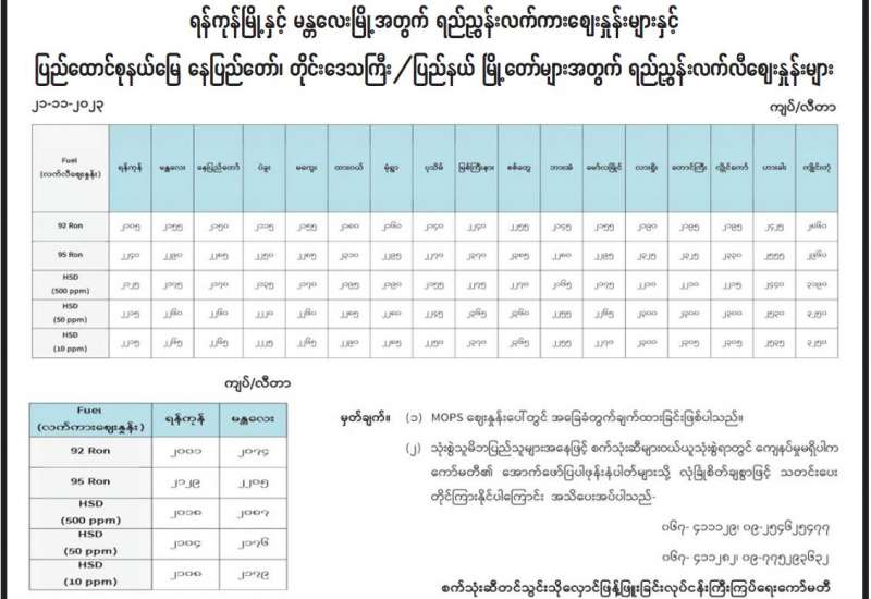 ရန်ကုန်မြို့နှင့် မန္တလေးမြို့အတွက် ရည်ညွှန်းလက်ကားဈေးနှုန်းများနှင့် ပြည်ထောင်စုနယ်မြေ နေပြည်တော်၊ တိုင်းဒေသကြီး/ ပြည်နယ် မြို့တော်များအတွက် ရည်ညွှန်းလက်လီဈေးနှုန်းများ