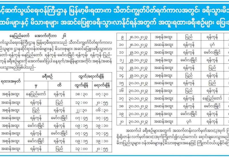 ပို့ဆောင်ရေးနှင့်ဆက်သွယ်ရေးဝန်ကြီးဌာန မြန်မာ့မီးရတားက သီတင်းကျွတ်ပိတ်ရက်ကာလအတွင်း ခရီးသွားမိဘပြည်သူများ၊ ဌာနဆိုင်ရာဝန်ထမ်းများနှင့် မိသားစုများ အဆင်ပြေစွာခရီးသွားလာနိုင်ရန်အတွက် အထူးရထားခရီးစဉ်များ ပြေးဆွဲပေးသွားမည်