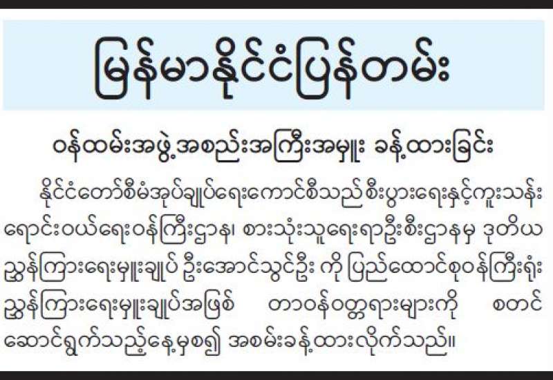 ၂၀၁၂ ခုနှစ် လူမှုဖူလုံရေးဥပဒေနှင့်အညီ ပြည်ထောင်စုနယ်မြေအတွင်း အကျုံးဝင်မှတ်ပုံတင်ထားသော အလုပ်ဌာနများမှ အာမခံအလုပ်သမားများအား အကျိုးခံစားခွင့်များ ထုတ်ပေးခြင်းအခမ်းအနားကို ယနေ့မွန်းလွဲပိုင်းတွင် နေပြည်တော်ရှိ လူမှုဖူလုံရေးအဖွဲ့(ရုံးချုပ်) စုဝေးခန်းမ၌ ကျင်းပသည်။
