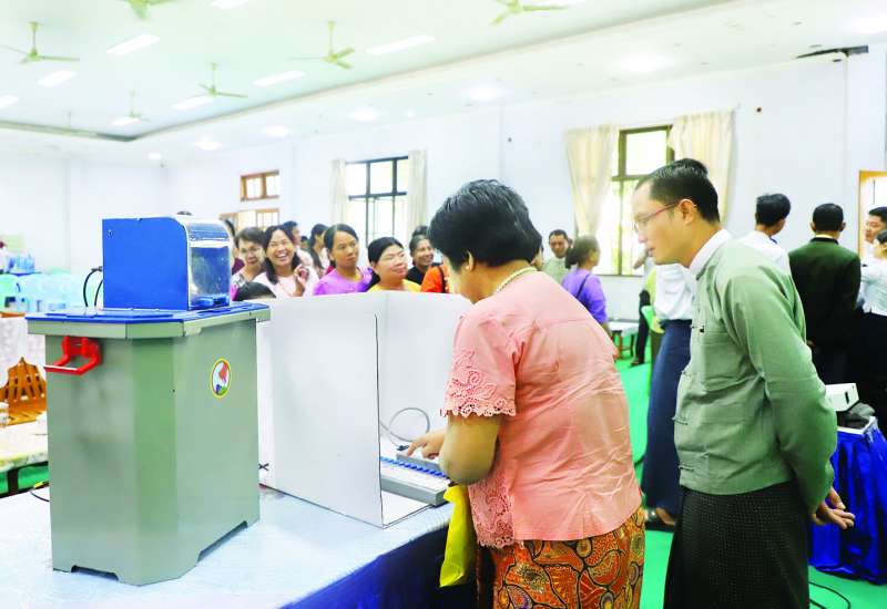 ပြည်ထောင်စုရွေးကောက်ပွဲကော်မရှင်သည် မြန်မာအီလက်ထရောနစ် မဲပေးစက် ရှင်းလင်းပြသခြင်းနှင့် လက်တွေ့သရုပ်ပြ စမ်းသပ်မဲပေးခြင်းများကို မဲဆန္ဒရှင် အသိပညာပေးလုပ်ငန်း တစ်ရပ်အနေဖြင့် ဆောင်ရွက်လျက်ရှိရာ ယနေ့တွင် ဇမ္ဗူသီရိမြို့နယ်အတွင်း ပထမနေ့အဖြစ် ဇမ္ဗူသီရိမြို့နယ် အထွေထွေအုပ်ချုပ်ရေးဦးစီးဌာန အစည်းအဝေးခန်းမ၌ ဆောင်ရွက်သည်။