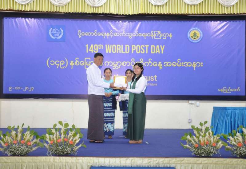 ၂၀၂၃ ခုနှစ် (၁၄၉) နှစ်မြောက် ကမ္ဘာ့စာပို့တိုက်နေ့အထိမ်းအမှတ်အခမ်းအနားကို ယနေ့နံနက် ၉ နာရီခွဲတွင် နေပြည်တော်ရှိ ပို့ဆောင်ရေးနှင့်ဆက်သွယ်ရေးဝန်ကြီးဌာန၌ ကျင်းပသည်။