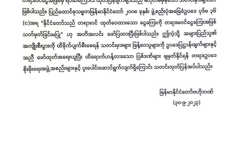 လတ်တလော လူမှုကွန်ရက်စာမျက်နှာများတွင် မြန်မာငွေ ငါးဆယ်ကျပ်တန်နှင့် တစ်ရာ ကျပ်တန်ငွေစက္ကူများကို မြန်မာနိုင်ငံတော်ဗဟိုဘဏ်သို့ လာရောက်အပ်နှံကြရန် နိုင်ငံတော်စီမံအုပ်ချုပ်ရေးကောင်စီအမည်ဖြင့် အမိန့်စာတစ်စောင်ထုတ်ပြန်ထားကြောင်း ပျံ့နှံ့လျက်ရှိရာ အဆိုပါကိစ္စရပ်နှင့်ပတ်သက်၍ မြန်မာငွေ ငါးဆယ်ကျပ်တန်နှင့် တစ်ရာကျပ် တန်ငွေစက္ကူများနှင့်ပတ်သက်၍ နိုင်ငံတော်စီမံအုပ်ချုပ်ရေးကောင်စီ သတင်းထုတ်ပြန်ရေးအဖွဲ့ခေါင်းဆောင် ဗိုလ်ချုပ်ဇော်မင်းထွန်းက ယခုလိုပြန်လည်ပြောကြားပါသည်။