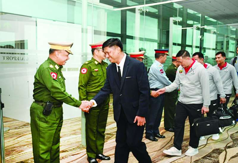 တရုတ်ပြည်သူ့သမ္မတနိုင်ငံ ဟန်ကျိုးမြို့၌ စက်တင်ဘာ ၂၃ ရက်မှ အောက်တိုဘာ ၈ ရက် အထိ ကျင်းပပြုလုပ်လျက်ရှိသည့် (၁၉)ကြိမ်မြောက် အာရှအားကစားပြိုင်ပွဲသို့ တက်ရောက်ခဲ့သည့် မြန်မာနိုင်ငံအိုလံပစ်ကော်မတီ ဥက္ကဋ္ဌ အားကစားနှင့်လူငယ်ရေးရာဝန်ကြီးဌာန ပြည်ထောင်စုဝန်ကြီး ဦးမင်းသိန်းဇံနှင့်အတူ မြန်မာအားကစားအဖွဲ့သည် ယနေ့ မွန်းလွဲပိုင်းတွင် လေကြောင်းခရီးဖြင့် ရန်ကုန်မြို့သို့ ပြန်လည်ရောက်ရှိလာရာ မြန်မာနိုင်ငံဆိုင်ရာတရုတ်ပြည်သူ့သမ္မတနိုင်ငံသံရုံးမှ ယဉ်ကျေးမှုသံမှူး Mr. Pan Feng ၊ အားကစားနှင့် ကာယပညာသိပ္ပံ (ရန်ကုန်) ကျောင်းအုပ်ကြီး ညွှန်ကြားရေးမှူး ဦးအောင်နိုင်ဆွေ၊ ရန်ကုန်တိုင်းဒေသကြီး အားကစားနှင့်ကာယပညာဦးစီးဌာန ညွှန်ကြားရေးမှူး ဦးအောင်မိုးနှင့် တာဝန်ရှိသူများက ရန်ကုန်အပြည်ပြည်ဆိုင်ရာလေဆိပ်၌ ကြိုဆိုခဲ့ကြသည်။