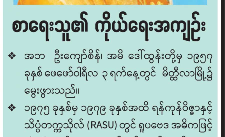 တက္ကသိုလ်နှစ်တစ်ရာပြည့် ဆောင်းပါးများ သတင်းစာများတွင် နေ့စဉ်ဖတ်ရသည်မှာ လွမ်းမောဖွယ်အပြည့် ဖတ်၍အားမရ၊ အတိတ်ကအကြောင်းများ တွေးမဆုံး။ ၁၂-၁၂-၂၀၂၀ရက်နေ့ သတင်းစာတွင် ပါမောက္ခဒေါက်တာ စန်းဝင်းရေးသည့် Mr. E J Kangyi အကြောင်းပါတော့ စဉ်းစားမိသည်။ ငါတို့အရွယ်များသည် ကြွေသူကြွေ၊ သေသူသေ အိုမင်းမစွမ်းဖြစ်ကုန်ကြပြီဆိုတော့ ဘယ်ရေးနိုင်တော့မှာလဲ။ ကိုယ်ကိုယ်တိုင်လည်း ၈၇ နှစ်ကျော် ၈၈ နှစ်နီးတော့ ဘောပင်တောင် မထိန်းနိုင်၊ လက်ရေးက ဖတ်မရတော့သည့် အခြေအနေ။