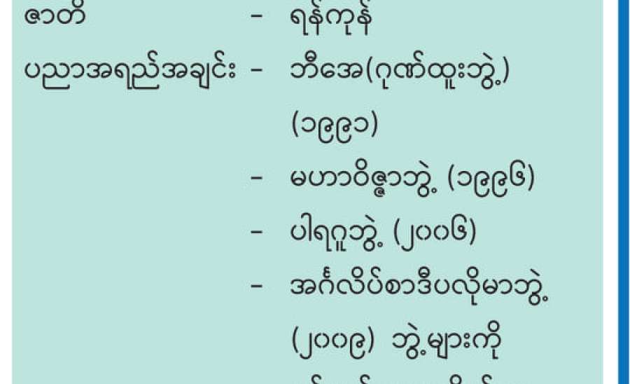 | 12/02/2020 ရန်ကုန်တက္ကသိုလ်ရာပြည့်အထိမ်းအမှတ်အမိရန်ကုန်တက္ကသိုလ်ကို လွမ်းပါသည် ရန်ကုန်တက္ကသိုလ်နှစ်တစ်ရာတိုင်ခဲ့ပါပြီ။ နယ်တက္ကသိုလ် မှာ တာဝန်ထမ်းဆောင် နေသော ကျွန်မအဖို့ ကျောင်းတော် ကြီးကို လွမ်းပါသည်။ မိမိအားနားခိုခွင့်ပေးခဲ့သော၊ မိမိအား ပညာသင်ကြားပေးခဲ့ကြသော ဆရာကြီး ဆရာမကြီးများ၊ တာဝန်အတူ ထမ်းရွက်ခဲ့ကြသော စီနီယာ အစ်ကိုအစ်မများ၊ မိတ်ဆွေသူငယ်ချင်းများ၊ မောင်ငယ် ညီမငယ်များအားလုံးကို အမှတ်ရနေ ပါသည်။ Read more