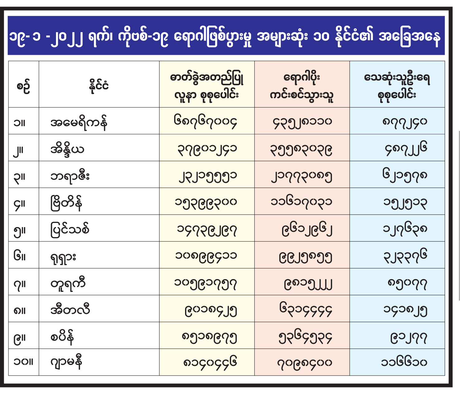 ၁၉- ၁ -၂၀၂၂ ရက်၊ ကိုဗစ်-၁၉ ရောဂါဖြစ်ပွားမှု အများဆုံး ၁၀ နိုင်ငံ၏ အခြေအနေ
