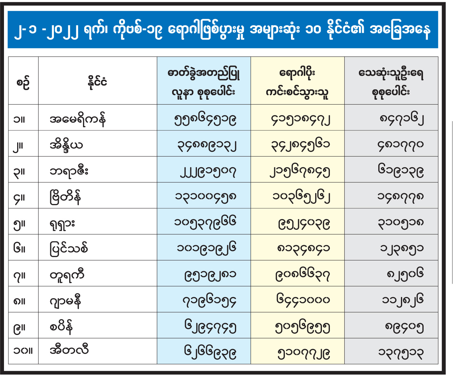 ၂- ၁ -၂၀၂၂ ရက်၊ ကိုဗစ်-၁၉ ရောဂါဖြစ်ပွားမှု အများဆုံး ၁၀ နိုင်ငံ၏ အခြေအနေ