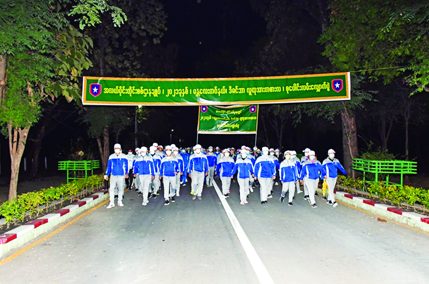 ၂၀၂၁ ခုနှစ် ဒီဇင်ဘာအားကစား လ စုပေါင်းလမ်းလျှောက်ပွဲကို ယနေ့နံနက်ပိုင်းတွင် ရန်ကုန်တိုင်း စစ်ဌာနချုပ်နှင့် အလယ်ပိုင်းတိုင်း စစ်ဌာနချုပ်တို့၌ ပြုလုပ်ရာ တိုင်းဒေသကြီး ဝန်ကြီးချုပ်၊ သက်ဆိုင်ရာ တိုင်းစစ်ဌာနချုပ် များမှ တိုင်းမှူးများနှင့် အရာရှိ၊ စစ်သည်၊ မိသားစုများ ပါဝင် ဆင်နွှဲကြသည်။