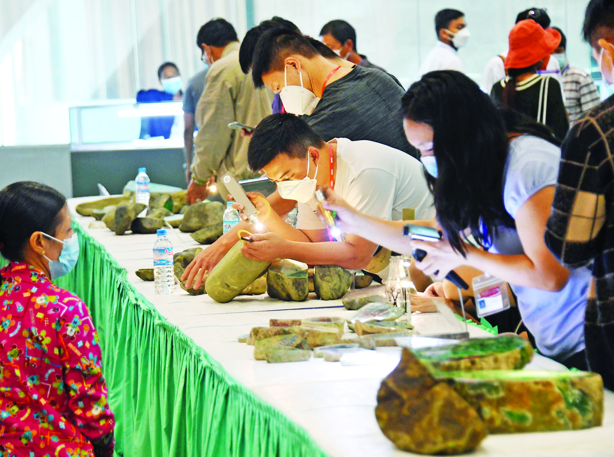 ဆက်လက်၍ ကျောက်စိမ်း အတွဲ အမှတ် (၁) မှ (၂၅၀)အထိ အိတ်ဖွင့်တင်ဒါစနစ်ဖြင့် ရောင်းချ ပေးခဲ့ရာ ရတနာကုန်သည်များ က ခင်းကျင်းပြသထားသည့် ကျောက်စိမ်းအတွဲများကို ကြည့်ရှု စစ်ဆေးကြပြီး ဈေးနှုန်းတင်သွင်း လွှာများကို တင်ဒါပုံးများအတွင်း သို့ ထည့်သွင်းကြသည်။