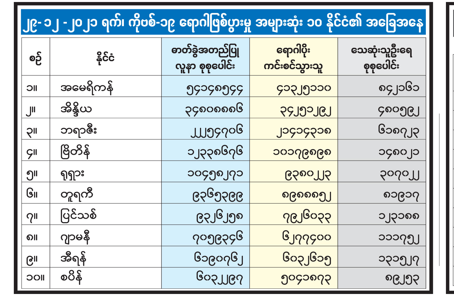 ၂၉- ၁၂ -၂၀၂၁ ရက်၊ ကိုဗစ်-၁၉ ရောဂါဖြစ်ပွားမှု အများဆုံး ၁၀ နိုင်ငံ၏ အခြေအနေ