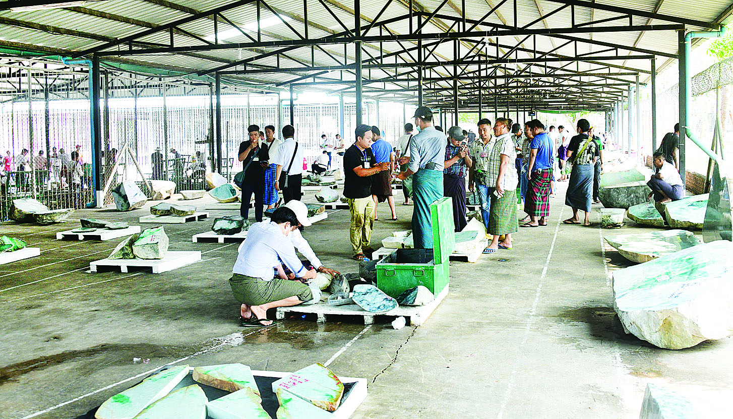 မွန်းလွဲပိုင်းတွင် မြန်မာ့ ကျောက်မျက်ရတနာပြပွဲ ဗဟို ကော်မတီနာယက သယံဇာတနှင့် သဘာဝပတ်ဝန်းကျင် ထိန်းသိမ်း ရေးဝန်ကြီးဌာန ပြည်ထောင်စု ဝန်ကြီး ဦးခင်မောင်ရီနှင့် ပြပွဲ ဗဟိုကော်မတီဝင်များသည် မဏိ ရတနာ ကျောက်စိမ်းခန်းမ အတွင်းရှိ ကျောက်စိမ်းအတွဲများ အိတ်ဖွင့်တင်ဒါစနစ်ဖြင့် ရောင်းချ ပေးနေမှုကို ကြည့်ရှုအားပေးသည်။