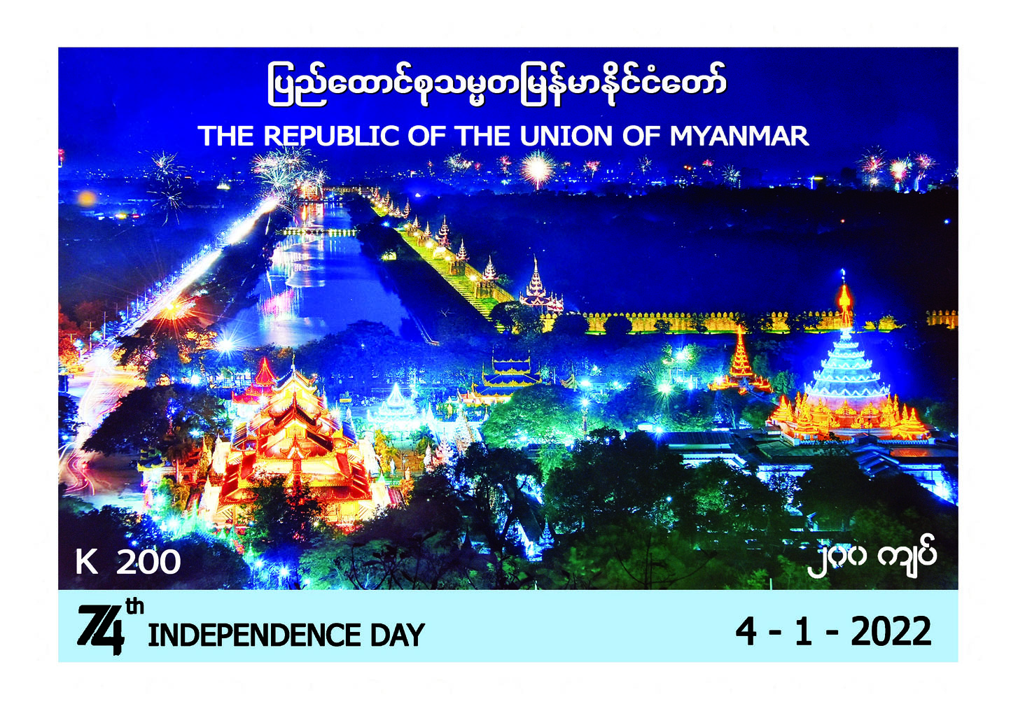 ပို့ဆောင်ရေးနှင့် ဆက်သွယ်ရေး ဝန်ကြီးဌာန မြန်မာ့စာတိုက် လုပ်ငန်းက (၇၄) နှစ်မြောက် လွတ်လပ်ရေးနေ့ အထိမ်းအမှတ် အထူးထုတ် (၂၀၀ ကျပ်တန်) စာပို့တံဆိပ်ခေါင်းသစ် သုံးမျိုးကို ၂၀၂၂ ခုနှစ် ဇန်နဝါရီ ၄ ရက်၊ မြန်မာသက္ကရာဇ် ၁၃၈၃ ခုနှစ် ပြာသိုလဆန်း ၃ ရက်(အင်္ဂါနေ့) နံနက် ၉ နာရီခွဲမှစတင်၍ နေပြည် တော် ဗဟိုစာတိုက်ကြီး၊ ရန်ကုန် စာတိုက်ကြီး၊ မန္တလေးစာတိုက် ကြီးတို့နှင့် တိုင်းဒေသကြီး / ပြည်နယ်များရှိ စာတိုက်များတွင် ရောင်းချပေးသွားမည် ဖြစ်သည်။