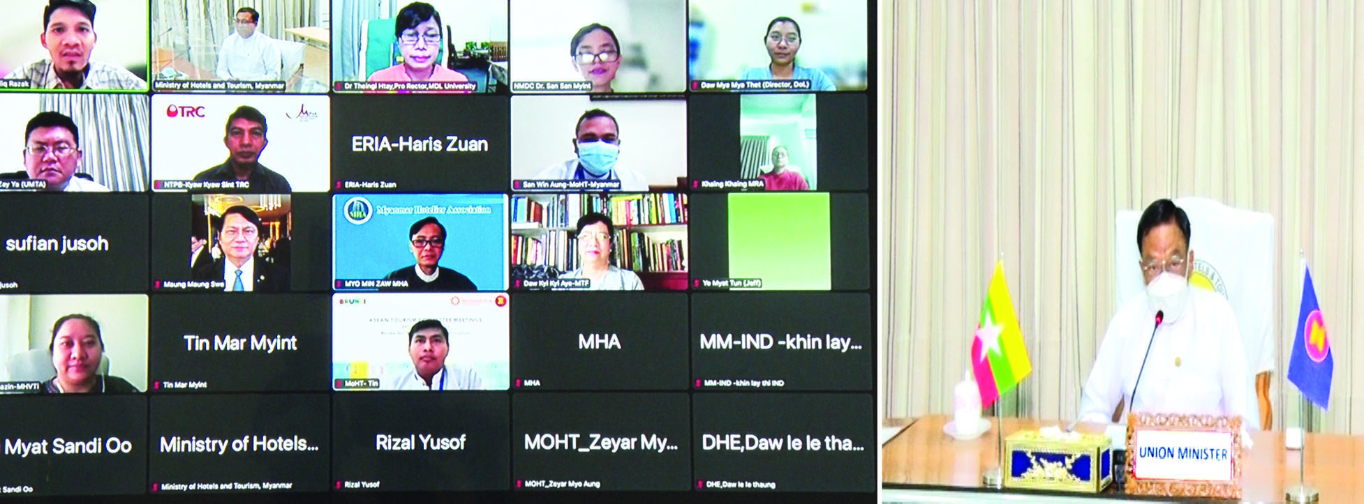 အာဆီယံဒေသအတွင်း အာဆီယံ ခရီးသွားလုပ်ငန်း ကျွမ်းကျင်ပညာ ရှင်များ အပြန်အလှန် အသိအမှတ် ပြုရေးအစီအစဉ် ASEAN Mutual Recognition Arrangement on Tourism Professionals (ASEAN MRA-TP) အကောင်အထည်ဖော်မှု ကို မြှင့်တင်နိုင်ရေး လေ့လာ သုံးသပ်မှုစာတမ်းကို အာဆီယံနှင့် အရှေ့အာရှစီးပွားရေးသုတေသန အဖွဲ့ (Economic Research Institute for ASEAN and East Asia-ERIA)က ရေးဆွဲပြုစုလျက် ရှိရာ မြန်မာနိုင်ငံတွင် ဆောင်ရွက် နေမှု အခြေအနေများနှင့် စပ်လျဉ်း ၍ သဘောထားအကြံပြုချက်များ ရယူနိုင်ရန်အတွက် မြန်မာနိုင်ငံမှ ဟိုတယ်နှင့် ခရီးသွားလုပ်ငန်း ဆိုင်ရာ အစိုးရနှင့် ပုဂ္ဂလိက ကိုယ်စားလှယ်များနှင့် တွေ့ဆုံ ဆွေးနွေးပွဲကို ယနေ့နံနက်ပိုင်း တွင် ဟိုတယ်နှင့်ခရီးသွားလာရေး ဝန်ကြီးဌာန အစည်းအဝေးခန်းမ၌ Video Conferencing စနစ်ဖြင့် ကျင်းပသည်။