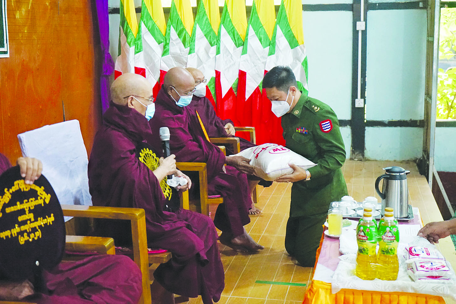 ယင်းနောက် ခရိုင်စီမံအုပ်ချုပ် ရေးအဖွဲ့၊ အဖွဲ့ဝင် (၁) ဒုတိယ ဗိုလ်မှူးကြီး မောင်မောင်ငြိမ်းကသာသနာရေးဆိုင်ရာ ကိစ္စရပ် များကို လျှောက်ထားခဲ့ပြီး တာဝန် ရှိသူများက မြို့နယ်အတွင်းရှိ ဝါဆိုသံဃာ၁၀၅၈ ပါး၊ သီလရှင် ၄၇ ပါးတို့အတွက် တစ်ပါးလျှင် ဆွမ်းဆန်ခြောက်ပြည်၊ ဆီ ၂၅ ကျပ်သား၊ ဆား ၂၅ ကျပ်သား နှုန်းဖြင့်စုစုပေါင်း ဆွမ်းဆန် ၂၇၇ အိတ်၊ ဆီ ၂၇၆ ပိဿာ၊ ဆား ၂၇၆ ပိဿာတို့ကို ဆက်ကပ်လှူဒါန်း ကာ ကောင်းမှုအစုစုတို့အတွက် ရေစက်သွန်းချ အမျှပေးဝေ ကြောင်း သိရသည်။