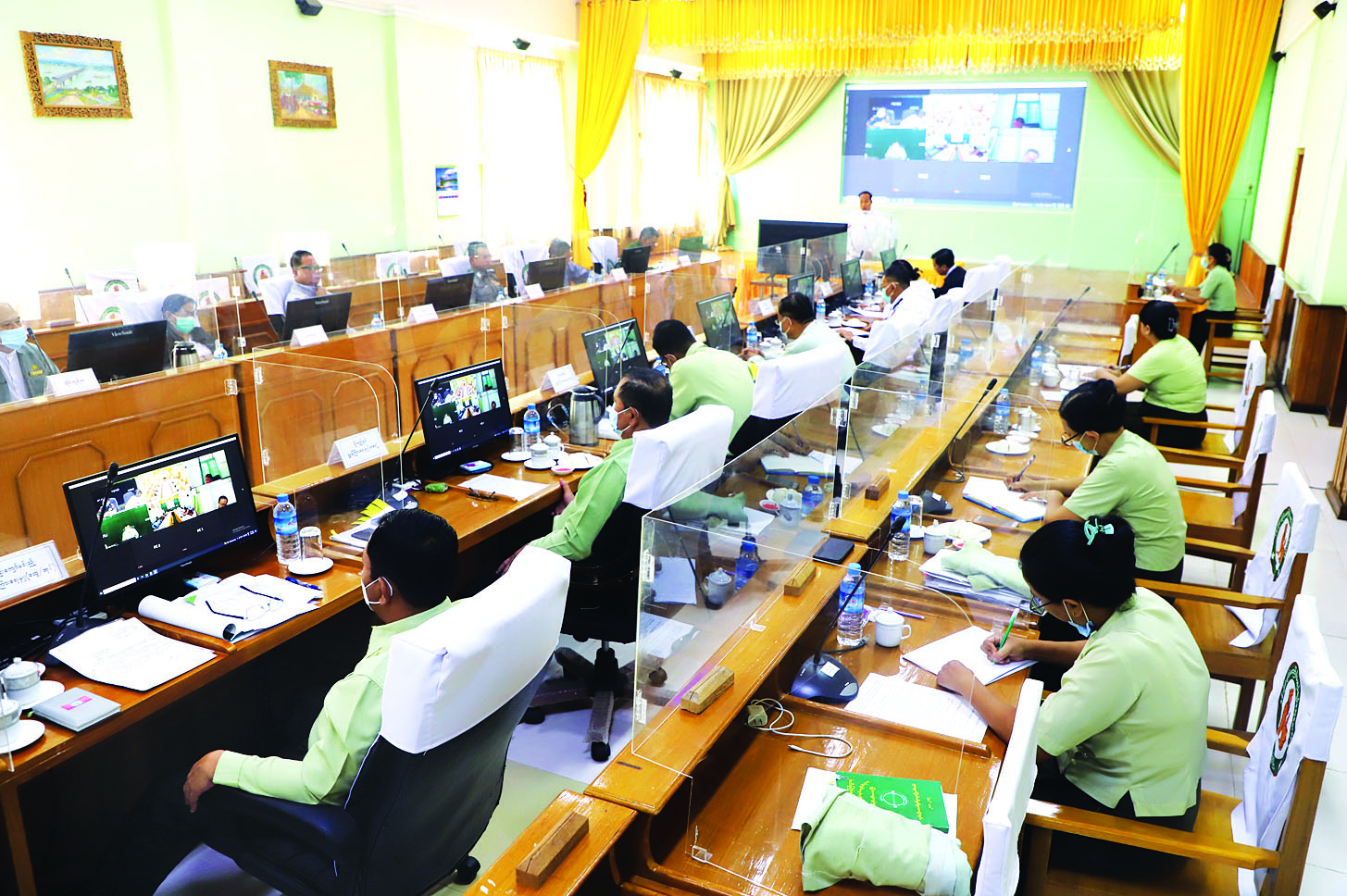 စစ်ကိုင်းတိုင်းဒေသကြီးအစိုးရအဖွဲ့၏ ဒေသတည်ငြိမ် အေးချမ်းရေး အကောင်အထည်ဖော်ဆောင်ရွက်နေ သည့်လုပ်ငန်းများ   အောင်မြင်ရေး   ညှိနှိုင်းအစည်း အဝေးကို   ယမန်နေ့က    တိုင်းဒေသကြီးအစိုးရအဖွဲ့ရုံး အစည်းအဝေးခန်းမ၌ ပြုလုပ်ရာ     တိုင်းဒေသကြီး ဝန်ကြီးချုပ်နှင့် ဝန်ကြီးများ၊  တိုင်းဒေသကြီးအဆင့် ဌာနဆိုင်ရာများ တက်ရောက်ပြီး ခရိုင်စီမံအုပ်ချုပ်ရေး အဖွဲ့ ဥက္ကဋ္ဌများနှင့်   နာဂကိုယ်ပိုင်အုပ်ချုပ်ခွင့်ရ ဒေသဦးစီးအဖွဲ့ ဥက္ကဋ္ဌတို့က Video Conferencing စနစ်ဖြင့် တက်ရောက်သည်။