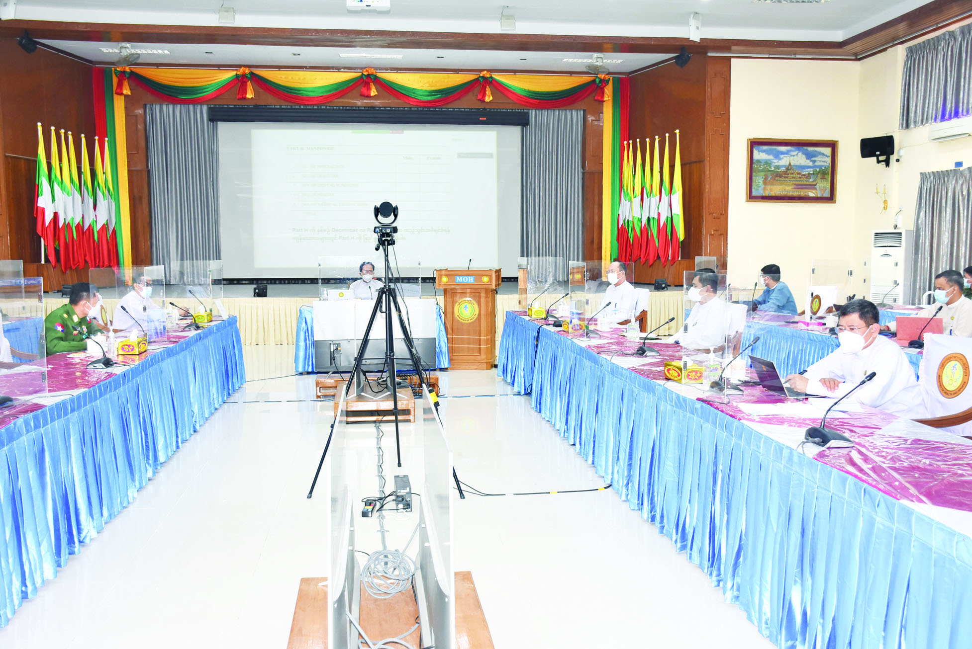 အစည်းအဝေးသို့ ကျန်းမာရေးဝန်ကြီးဌာန ပြည်ထောင်စု ဝန်ကြီး ဒေါက်တာသက်ခိုင်ဝင်း၊ ဒုတိယဝန်ကြီး ဒေါက်တာ အေးထွန်းနှင့် တာဝန်ရှိသူများ၊ တပ်မတော် ကြည်း၊ ရေ၊ လေ သတင်းနှင့် နည်းပညာဌာနမှ ဌာနကြီးမှူး ဗိုလ်မှူးချုပ် မြတ်မင်း ဦးနှင့် တာဝန်ရှိသူများ၊ ရန်ကုန်ပြည်သူ့ဆေးရုံကြီး၊ မြောက်ဥက္ကလာပ ပြည်သူ့ဆေးရုံကြီး၊ နေပြည်တော်ပြည်သူ့ဆေးရုံကြီး (ခုတင်-၁၀၀၀)နှင့် ပြည်သူ့ဆေးရုံ ကြီး ပျဉ်းမနားမြို့မှ ဆေးရုံအုပ် ကြီးများ တက်ရောက်ကြသည်။