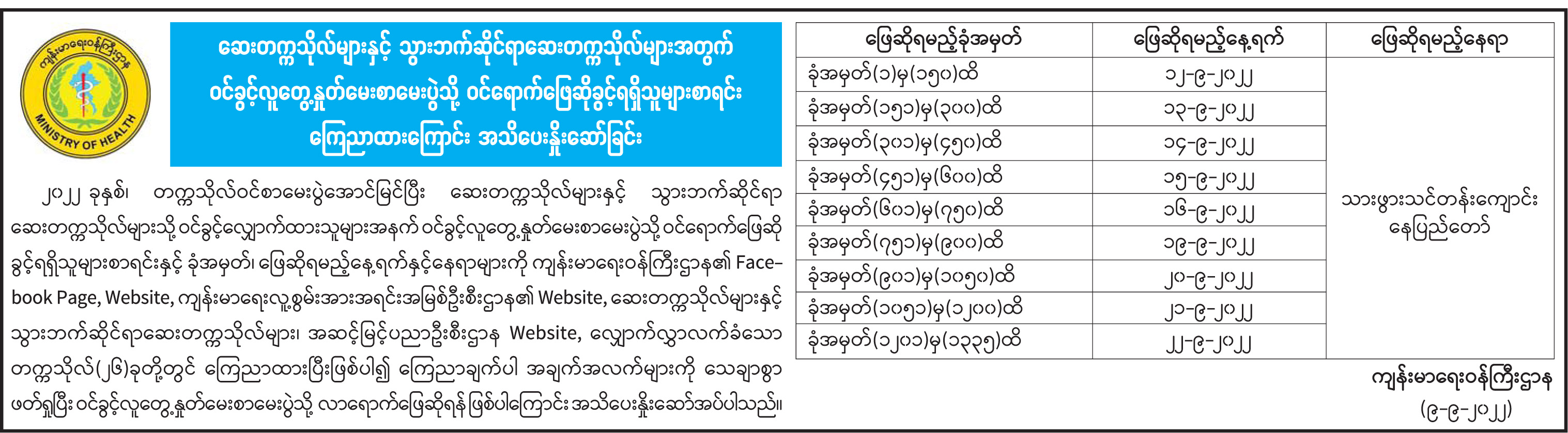 ၂၀၂၂ ခုနှစ်၊ တက္ကသိုလ်ဝင်စာမေးပွဲအောင်မြင်ပြီး ဆေးတက္ကသိုလ်များနှင့် သွားဘက်ဆိုင်ရာ ဆေးတက္ကသိုလ်များသို့ ဝင်ခွင့်လျှောက်ထားသူများအနက် ဝင်ခွင့်လူတွေ့နှုတ်မေးစာမေးပွဲသို့ ဝင်ရောက်ဖြေဆို ခွင့်ရရှိသူများစာရင်းနှင့် ခုံအမှတ်၊ ဖြေဆိုရမည့်နေ့ရက်နှင့်နေရာများကို ကျန်းမာရေးဝန်ကြီးဌာန၏ Face-book Page, Website, ကျန်းမာရေးလူ့စွမ်းအားအရင်းအမြစ်ဦးစီးဌာန၏ Website, ဆေးတက္ကသိုလ်များနှင့် သွားဘက်ဆိုင်ရာဆေးတက္ကသိုလ်များ၊ အဆင့်မြင့်ပညာဦးစီးဌာန Website, လျှောက်လွှာလက်ခံသော တက္ကသိုလ်(၂၆)ခုတို့တွင် ကြေညာထားပြီးဖြစ်ပါ၍ ကြေညာချက်ပါ အချက်အလက်များကို သေချာစွာ ဖတ်ရှုပြီး ဝင်ခွင့်လူတွေ့နှုတ်မေးစာမေးပွဲသို့ လာရောက်ဖြေဆိုရန် ဖြစ်ပါကြောင်း အသိပေးနှိုးဆော်အပ်ပါသည်။