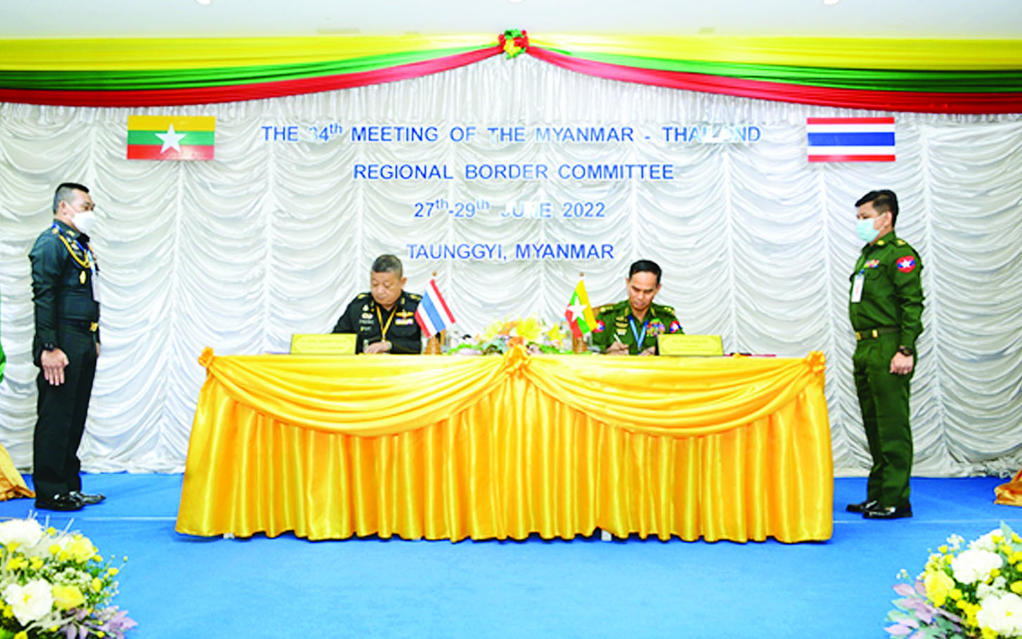 ဦးစွာ မြန်မာကိုယ်စားလှယ်အဖွဲ့ခေါင်းဆောင် ဒုတိယဗိုလ်ချုပ်ကြီး အောင်စိုးနှင့် ထိုင်းကိုယ်စားလှယ် အဖွဲ့ခေါင်းဆောင် Lt.Gen. Apichet Suesat တို့က (၃၄)ကြိမ်မြောက် မြန်မာ-ထိုင်း ဒေသဆိုင်ရာနယ်ခြား ကော်မတီအစည်းအဝေး သဘောတူညီချက်ကို အတည်ပြုလက်မှတ်ရေးထိုးကာ(ယာပုံ) အပြန်အလှန် လဲလှယ်ကြသည်။