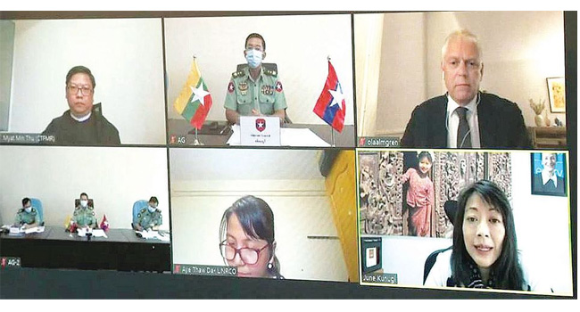 အရွယ်မရောက်သေးသူ ကလေး သူငယ်များအား စစ်မှုထမ်းခြင်းမှ ကာကွယ်တားဆီးရေးကိစ္စနှင့်စပ်လျဉ်း ၍ ယမန်နေ့ နံနက်ပိုင်းက Video Conference ဖြင့် ကျင်းပရာ ကာကွယ်ရေးဦးစီးချုပ်ရုံး (ကြည်း)မှ စစ်ရေးချုပ် ဒုတိယဗိုလ်ချုပ်ကြီး မျိုးဇော်သိန်းနှင့် တပ်မတော်အရာရှိ ကြီးများ၊ CTFMR ပူးတွဲဥက္ကဋ္ဌများ ဖြစ်ကြသည့် မြန်မာနိုင်ငံဆိုင်ရာ ကုလသမဂ္ဂဌာနေညှိနှိုင်းရေးမှူး Mr. Ola Almgren ၊ မြန်မာနိုင်ငံဆိုင်ရာ ယူနီဆက်ကိုယ်စားလှယ် Ms. June Kunugi နှင့် တာဝန်ရှိသူများ တက်ရောက်ကြသည်။