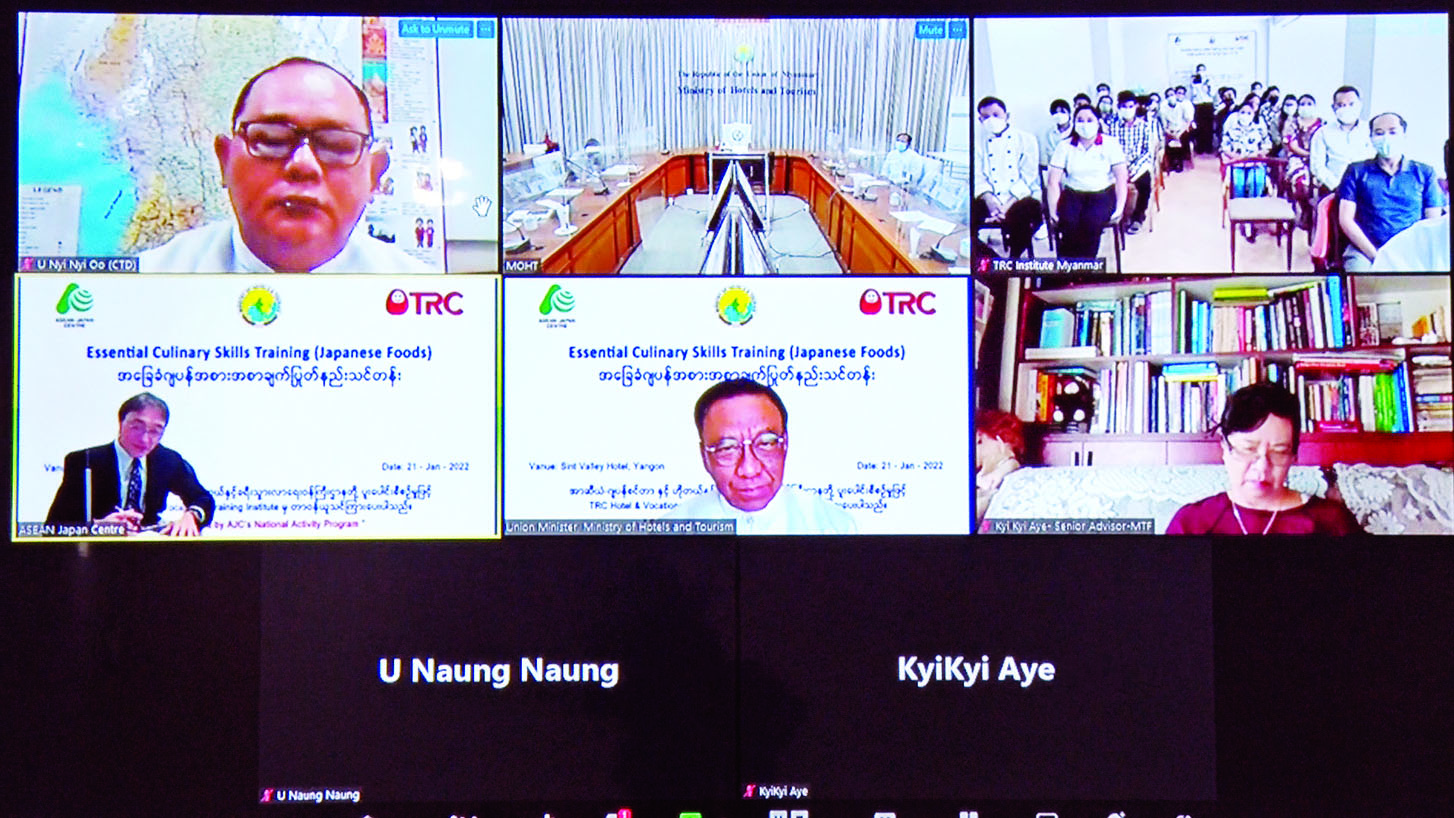 အာဆီယံ-ဂျပန်စင်တာ၏ ထောက်ပံ့မှုဖြင့် ဟိုတယ်နှင့် ခရီးသွားလာရေးဝန်ကြီးဌာနနှင့် TRC Hotel and Vocational Training Institute တို့ ပူးပေါင်းစီစဉ်ဖွင့်လှစ်သော အခြေခံဂျပန်အစားအစာ ချက်ပြုတ်နည်း သင်တန်းဖွင့်ပွဲကို ယမန်နေ့ မွန်းလွဲပိုင်းတွင် Online စနစ်ဖြင့် ကျင်းပသည်။