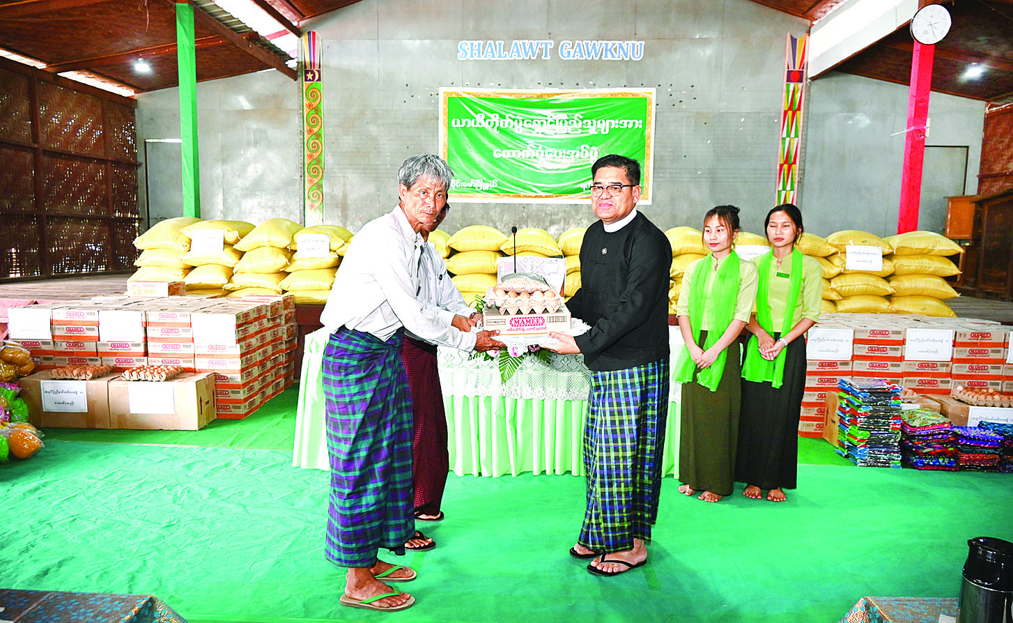 ယင်းနောက် ပြည်နယ်ဝန်ကြီးချုပ်၊  ပြည်နယ် တရားလွှတ်တော်တရားသူကြီးချုပ်နှင့် ပြည်နယ် ဝန်ကြီးများ၊  တာဝန်ရှိသူများက   ဝိုင်းမော်မြို့နယ် အတွင်းရှိ အောင်မြင်(၁/၂)၊ ရွှေညောင်ပင်၊ ကဇူး၊ ဒဘတ်ယန်၊ စန်းကား၊ နောင်ဟီး၊ အင်းလေး၊ ရွာသစ် ကျေးရွာများမှ လာရောက်တိမ်းရှောင် ခိုလှုံလျက်ရှိ သော  အိမ်ထောင်စု  စုစုပေါင်း  ၂၆၈ စု၊ လူဦးရေ  ၁၁၄၁ ဦးတို့အတွက် ကချင်ပြည်နယ်အစိုးရအဖွဲ့က စုစုပေါင်းငွေကျပ် ၉၂၉၄၀၀၀ တန်ဖိုးရှိ ဆန်အိတ် ၆၇  အိတ်ခွဲ၊      ခေါက်ဆွဲခြောက်    ၂၆၈  ဖာနှင့် ကြက်ဥ  ၄၅  လုံးကို     လည်းကောင်း၊     ပြည်နယ် ဘေးအန္တရာယ်ဆိုင်ရာစီမံခန့်ခွဲမှုဦးစီးဌာနက  ဆန် ရိက္ခာဖိုး  ငွေကျပ်  ၆၄၂၁၅၀၀၀  ကို  လည်းကောင်း၊ ပြည်နယ်လူမှုဝန်ထမ်းဦးစီးဌာနက သုံးနှစ်အောက် ကလေး ၄၀၉ ဦးတို့အတွက် ငွေကျပ် ၁၂၂၇၀၀၀၀၊ အသက် ၇၀ နှစ်နှင့်အထက်     ဘိုးဘွား  ၂၉၅  ဦးတို့ အတွက် ငွေကျပ် ၈၈၅၀၀၀၀၊ ကိုယ်ဝန်ဆောင်မိခင် ၆၄ ဦးတို့အတွက် ငွေကျပ် ၁၉၂၀၀၀၀၊ မသန်စွမ်း ၁၁၈ ဦးတို့အတွက်  ငွေကျပ်  ၃၅၄၀၀၀၀  ကို  လည်း ကောင်း၊ မြန်မာနိုင်ငံ အမျိုးသမီးများနှင့် ကလေး သူငယ်များဘဝမြှင့်တင်ရေးအသင်း   (MWCDF)  က   ငွေကျပ် ၁၈၉၃၁၀၀ တန်ဖိုးရှိ  ဆန်အိတ် ၁၀ အိတ်၊ ခေါက်ဆွဲ ခြောက် ၁၅ ဖာ၊   ကလေးကစားစရာအရုပ်များ နှင့်  မသန်စွမ်းအမျိုးသမီးများအတွက် အဝတ်အထည် များကို လည်းကောင်း၊ Humanity Inclusion (HI)က ငွေကျပ်  ၄၃၂၀၀၀ တန်ဖိုးရှိ မသန်စွမ်းအမျိုးသား များအတွက် အဝတ်အထည်များကို  လည်းကောင်း၊    ကချင် ပြည်နယ်   အမျိုးသမီးများ  လူမှုစီးပွားအကျိုးပြု စွမ်းဆောင်ရှင်များအသင်းက   ငွေကျပ်   ၂၂၄၀၀၀ တန်ဖိုးရှိ ကိုယ်ဝန်ဆောင်မိခင်များအတွက် လုံချည် များကိုလည်းကောင်း၊   စုစုပေါင်း   ကချင်ပြည်နယ် အစိုးရအဖွဲ့၊    ဌာနဆိုင်ရာများနှင့်    အဖွဲ့အစည်း အသီးသီးက ပစ္စည်းနှင့်ငွေသားတန်ဖိုး ၁၀၂၆၃၈၁၀၀ ကို ထောက်ပံ့ပေးအပ်ကြသည်။
