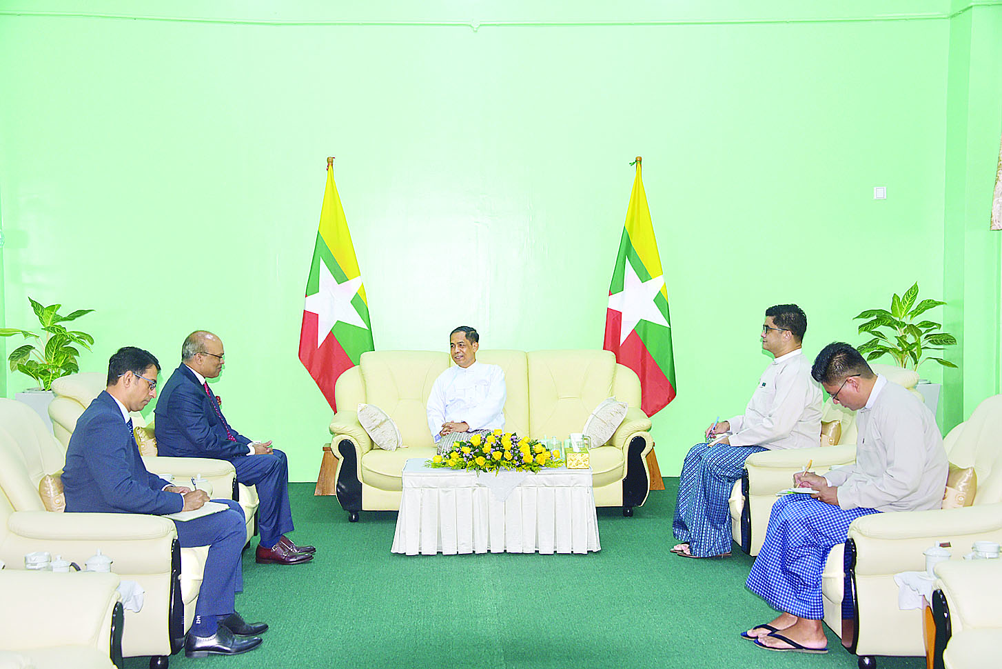 တွေ့ဆုံစဉ်       ပြည်ထောင်စု အစိုးရအဖွဲ့ရုံး   ဝန်ကြီးဌာန    (၂) ပြည်ထောင်စုဝန်ကြီး ဦးကိုကိုလှိုင် နှင့် မြန်မာနိုင်ငံဆိုင်ရာ  ဘင်္ဂလား ဒေ့ရှ်နိုင်ငံ သံအမတ်ကြီး H.E. Dr. Md Monwar Hossain  တို့သည် မြန်မာ-ဘင်္ဂလားဒေ့ရှ်      နှစ်နိုင်ငံ အကြား        ချစ်ကြည်ရင်းနှီးစွာ ဆက်ဆံရေး၊   နှစ်နိုင်ငံ  ကုန်သွယ် ရေးနှင့်    ရခိုင်ပြည်နယ်မှ   နေရပ် စွန့်ခွာသူများကို        ပြန်လည် လက်ခံရေးအပါအဝင်      နှစ်နိုင်ငံ အကြား        ပူးပေါင်းဆောင်ရွက်မှု ပိုမိုမြှင့်တင်ရန်      ကိစ္စရပ်များကို အမြင်ချင်းဖလှယ်၍       ရင်းနှီး ပွင့်လင်းစွာ ဆွေးနွေးကြသည်။
