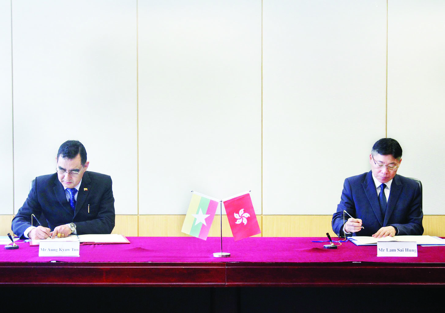 ပို့ဆောင်ရေးနှင့် ဆက်သွယ်ရေး ဝန်ကြီးဌာန ဒုတိယဝန်ကြီး ဦးအောင်ကျော်ထွန်းသည် ယနေ့ တွင် တရုတ်ပြည်သူ့သမ္မတနိုင်ငံ၊ ဟောင်ကောင်အထူးအုပ်ချုပ်ခွင့်ရ ဒေသ ဟောင်ကောင်မြို့ရှိ ဗဟိုအစိုးရရုံး အဆောက်အအုံ၌ ကျင်းပသည့် မြန်မာနိုင်ငံနှင့် ဟောင်ကောင်အထူးအုပ်ချုပ်ခွင့်ရ ဒေသတို့အကြား လေကြောင်း ပို့ဆောင်ရေး သဘောတူစာချုပ် လက်မှတ်ရေးထိုးပွဲ အခမ်းအနား သို့ တက်ရောက်သည်။