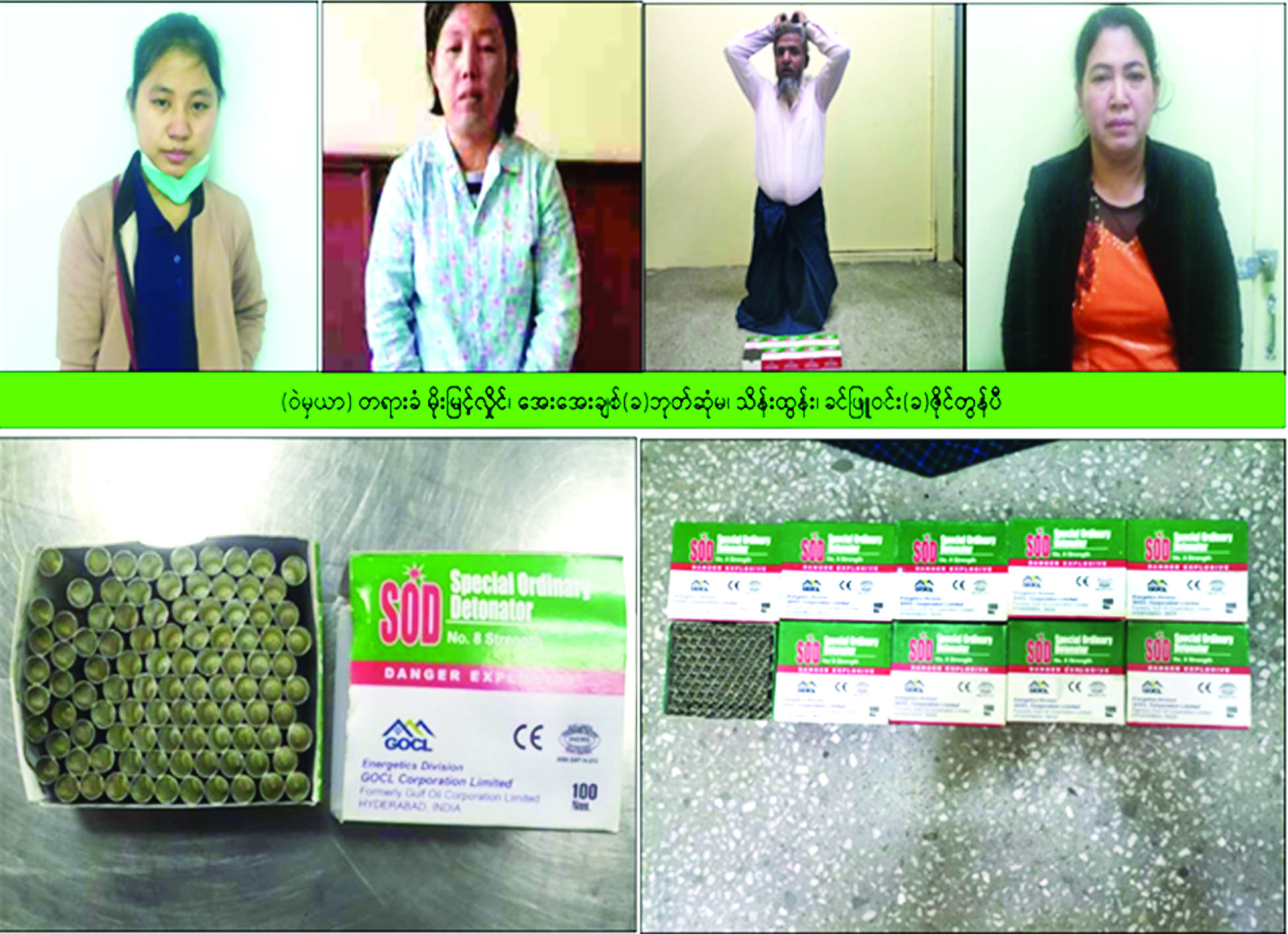 မန္တလေးတိုင်းဒေသကြီး တံတား ဦးမြို့နယ်ရှိ မန္တလေးပြည်ပြည် ဆိုင်ရာလေဆိပ် အမှတ်(၁)ထွက်ခွာ X-Ray စက်၌ တာဝန်ကျ တပ်ဖွဲ့ဝင်များက ခရီးသည်များကို ရှာဖွေစစ်ဆေးမှုများ ဆောင်ရွက် နေစဉ် လေယာဉ်အမျိုးအစား ART-72 ၊ ခရီးစဉ်အမှတ် K7-771 ဖြင့် မန္တလေးမြို့မှ ခန္တီးမြို့သို့ လိုက်ပါမည့်ခရီးသည် စစ်ကိုင်း တိုင်းဒေသကြီး ခန္တီးမြို့နယ် ဆင်သေကျေးရွာနေ မမိုးမြင့်လှိုင် (၂၀)နှစ် (ဘ) ဦးဟွန်းထိုက်၏ ဂျပ်ဖာဘူးအတွင်းမှ ဖလူဇာ ဆေးကတ်များဖြင့် ရောနှော သယ်ဆောင်လာသည့် (SOD- Special Ordinary Detonator) တံဆိပ်ပါဘူးအတွင်းမှ အကြမ်း ဖက်ဖောက်ခွဲရေး ပြုလုပ်ရာတွင် အသုံးပြုမည့် ဒီတိုနီတာ ၉၈ ခုကို တွေ့ရှိသိမ်းဆည်းရမိခဲ့ပြီး မမိုးမြင့် လှိုင်၏ ထွက်ဆိုချက်အရ အဆိုပါ ဒီတိုနီတာများကို သယ်ဆောင် ခိုင်းခဲ့သည့် မဟာအောင်မြေ မြို့နယ် ဟေမမာလာတောင် ရပ်ကွက် ၃၈ လမ်းနှင့် ၃၉ လမ်း ကြားရှိ အိမ်အမှတ် (၄၀)နေ မအေးအေးချစ် (ခ) ဘုတ်ဆုံမ (၃၉)နှစ် (ဘ)ဦးသိန်းချစ်နှင့် သယ်ဆောင်လာသည့် ဒီတိုနေတာ များကို လွှဲပြောင်းလက်ခံပေးမည့် ဆင်သေကျေးရွာနေ မမိုးမြင့်လှိုင် ၏ မိခင်ဖြစ်သူ ဒေါ်လောဟွေ(ခ)ဒေါ်ကြောင်ဖဟွေ (ခ) ဒေါ်တင် သိန်း (၆၃) နှစ်တို့ကို ၎င်းတို့၏ နေအိမ်အသီးသီးတွင် ထပ်မံ ဖမ်းဆီးရမိခဲ့သည်။