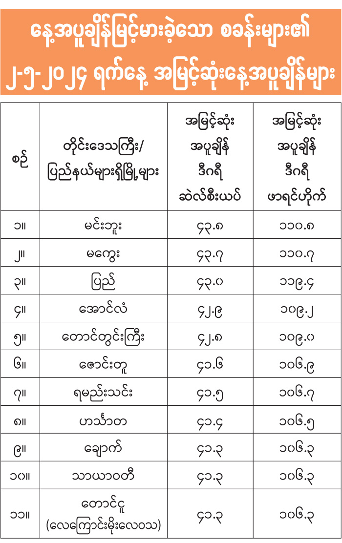 နေ့အပူချိန်မြင့်မားခဲ့သော စခန်းများ၏ ၂-၅-၂၀၂၄ ရက်နေ့ အမြင့်ဆုံးနေ့အပူချိန်များ
