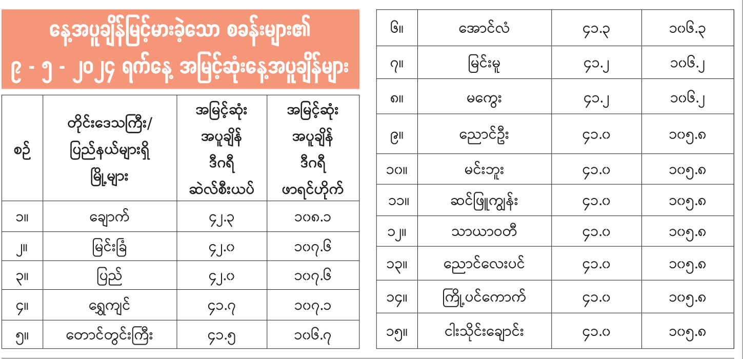 နေ့အပူချိန်မြင့်မားခဲ့သော စခန်းများ၏ ၉ - ၅ - ၂၀၂၄ ရက်နေ့ အမြင့်ဆုံးနေ့အပူချိန်များ