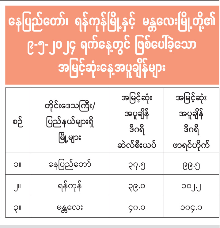နေပြည်တော်၊ ရန်ကုန်မြို့နှင့် မန္တလေးမြို့တို့၏ ၉-၅-၂၀၂၄ ရက်နေ့တွင် ဖြစ်ပေါ်ခဲ့သော အမြင့်ဆုံးနေ့အပူချိန်များ