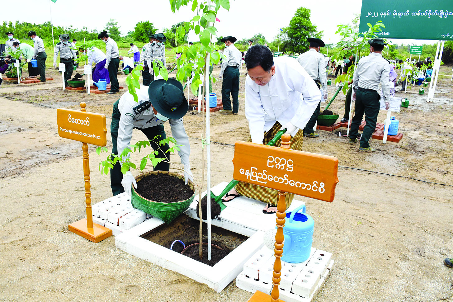 ထို့နောက် နေပြည်တော်ကောင်စီအဖွဲ့ဝင် ဗိုလ်မှူးကြီး မင်းနောင်က မဟော်ဂနီပင်ကိုလည်း ကောင်း၊ နေပြည်တော်ကောင်စီအဖွဲ့ဝင် ဦးဇေယျာလင်း က ပျဉ်းကတိုးပင်ကိုလည်းကောင်း၊ နေပြည်တော် ကောင်စီအဖွဲ့ဝင် ဦးမြင့်စိုးက တမလန်းပင်ကိုလည်း ကောင်း၊ နေပြည်တော်ကောင်စီအဖွဲ့ဝင် ရဲမှူးကြီး ကိုကိုလွင်က ယင်းမာပင်ကိုလည်းကောင်း၊ နေပြည် တော် ကောင်စီအဖွဲ့ဝင် ဦးကျော်သိန်းဆိုင်က ကျွန်းပင် ကိုလည်းကောင်း၊ နေပြည်တော်ကောင်စီ အတွင်းရေး မှူး ဒေါ်ဆွေဆွေနိုင်က ဆီသပြေပင်ကိုလည်းကောင်း သတ်မှတ်နေရာများတွင် စိုက်ပျိုးပေးကြသည်။